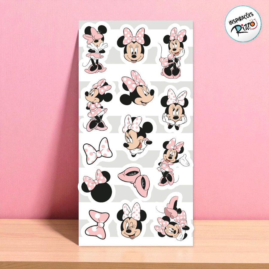 Adesivo Decorativo inspirado na personagem Minnie Mouse Disney, ideal para personalizar lembrancinhas, convites e diversos elementos da festa com o tema Minnie Rosa. A cartela inclui adesivos com estampas variadas da Minnie Disney em poses delicadas e divertidas, perfeitos para dar um toque especial em cada detalhe da decoração.