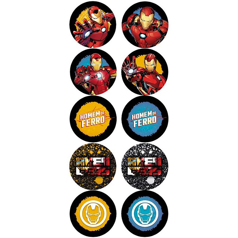 Adesivos redondos com estampa do Homem de Ferro, ideais para personalização de itens de festa.