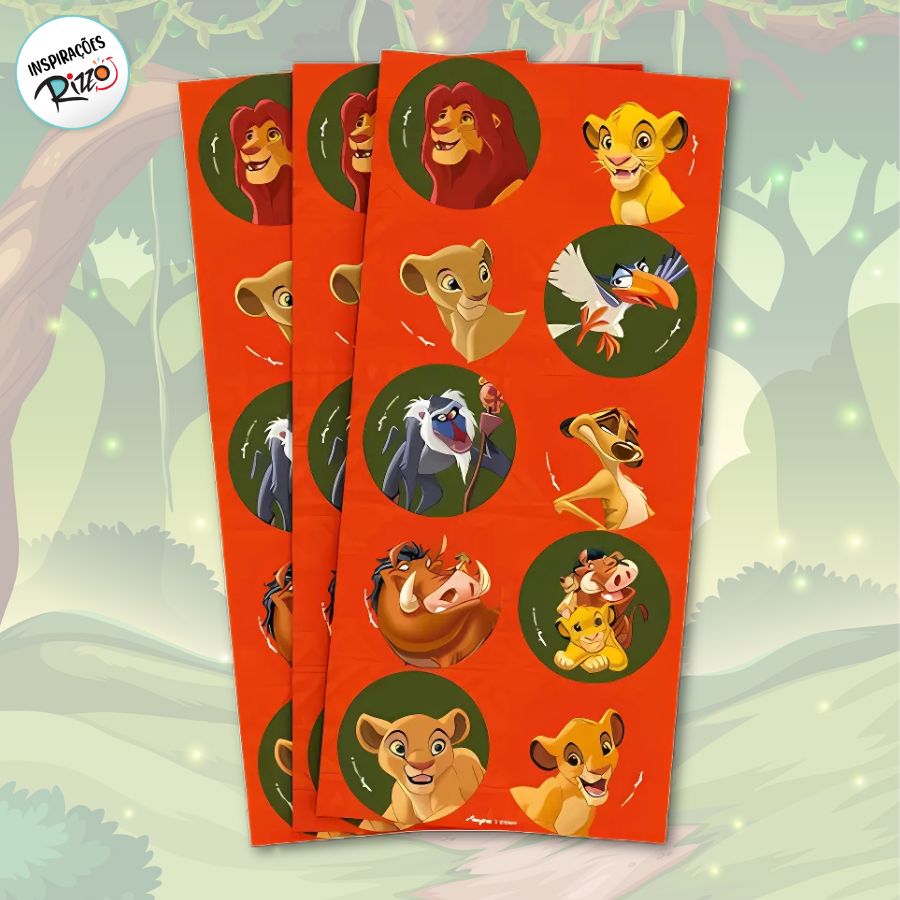 O Adesivo Redondo - Rei Leão acompanha 3 cartelas, cada uma com 10 adesivos, totalizando 30 unidades com estampas vibrantes e personagens do clássico da Disney. Com formato redondo, são perfeitos para personalizar lembrancinhas, sacolas, cadernos, convites e outros itens da festa temática.