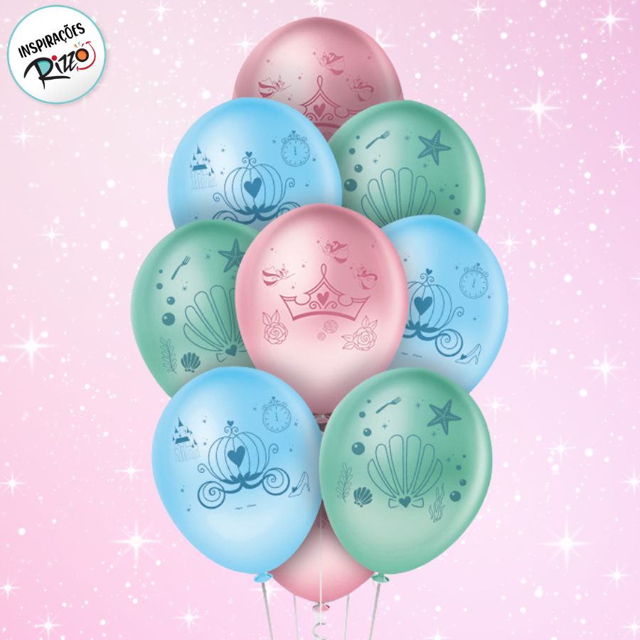 Balão de Festa Decorado 9" (23cm) com estampa inspirada nas Princesas Disney. Com cores delicadas e estampas sortidas, ele é ideal para compor painéis decorativos, arcos de balões e arranjos de mesa, trazendo toda a magia das personagens clássicas da Disney para a sua celebração.