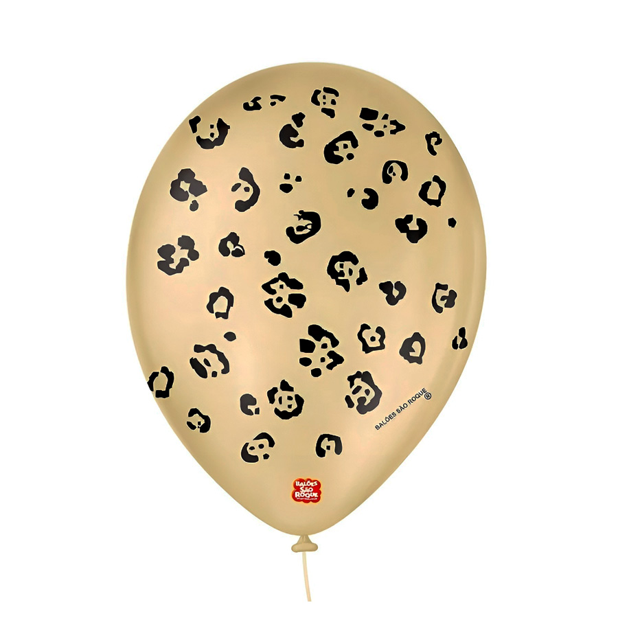 Balão liso de látex decorado com pintas de onça na cor areia e preto.