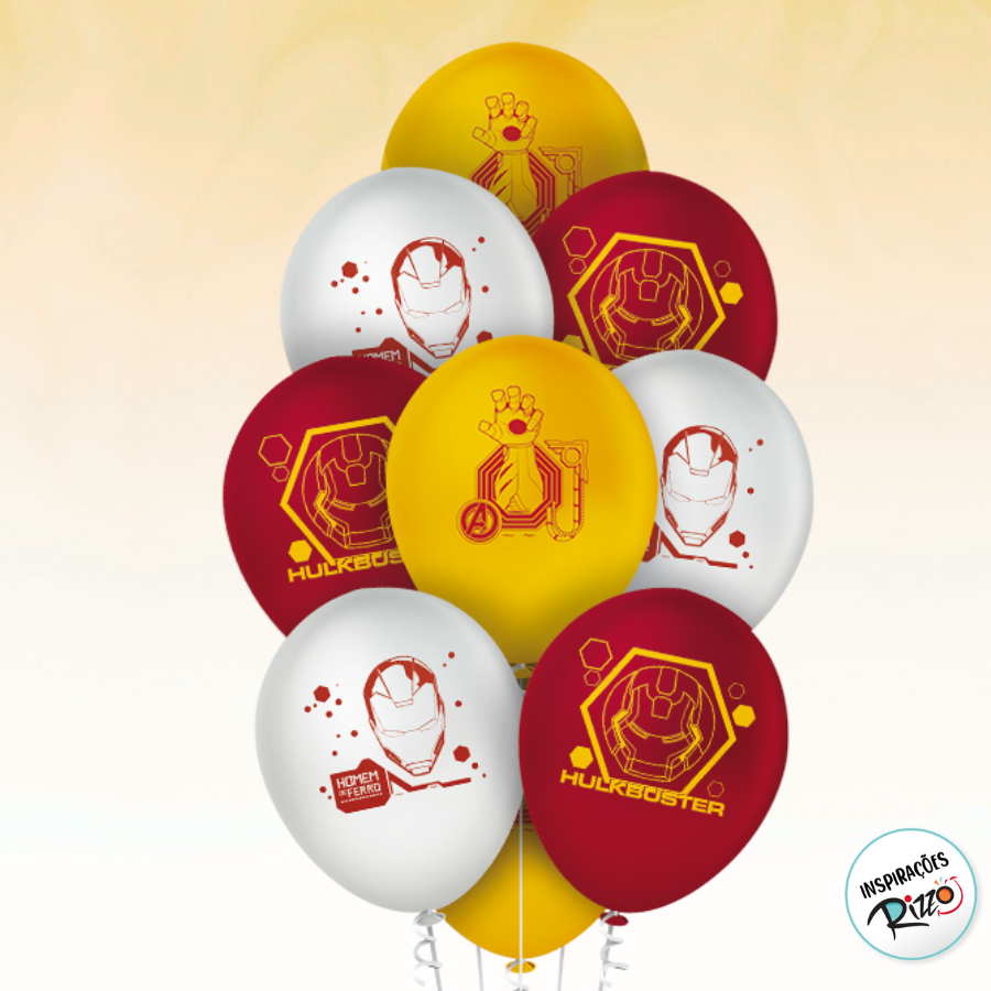 Balões de látex com estampa do Homem de Ferro, ideal para decoração de festas temáticas. Inflável com ar ou gás hélio.