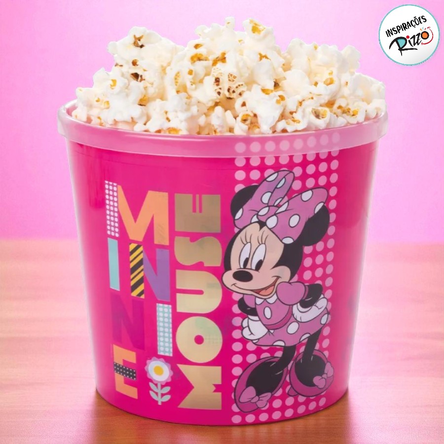 Balde de pipoca com estampa licenciada inspirada na personagem Minnie Mouse Disney.