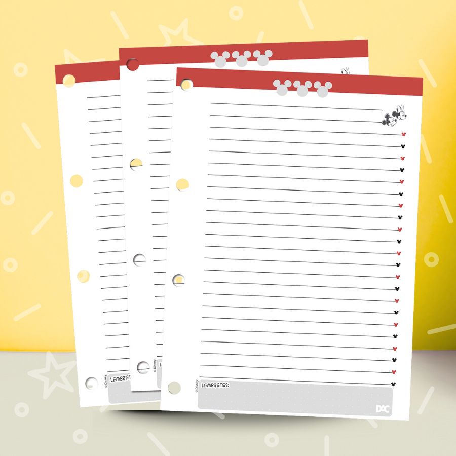 O Bloco Refil Mickey Mouse Disney é uma escolha versátil para quem busca organização sem abrir mão do design temático. Pode ser utilizado como refil para fichário universitário, complemento para caderno argolado ou material de apoio para estudos, cursinho e organização pessoal. As folhas decoradas ajudam a manter o visual do fichário sempre harmonioso, destacando o estilo atemporal de Mickey Mouse Disney. O papel offset 56g/m² permite escrita confortável com lápis e diferentes tipos de canetas, ideal para uso diário. Disponível na Loja Disney Rizzo, trata-se de um Produto Original Disney, criado para transformar o momento de estudar em uma experiência mais leve, organizada e cheia de estilo.