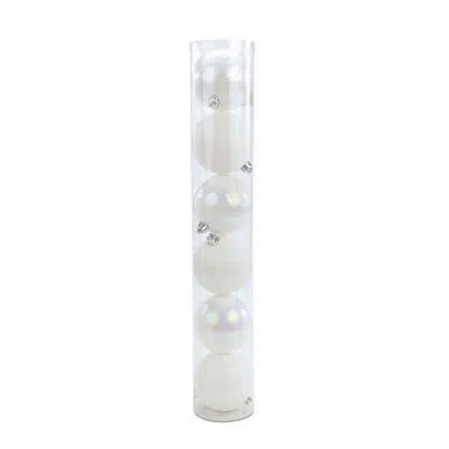 Bolas decorativas de Natal, sendo 2 lisa, 2 glitter e 2 nacarado na cor branca. Embalagem com 6 unidades de 10 cm de diâmetro cada.