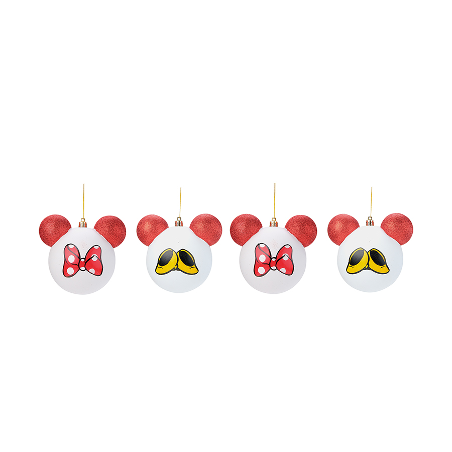 Bola de Natal cabeça da Minnie branca com orelhas vermelhas e desenho de laço e sapato da Minnie é o toque encantador que faltava para a sua decoração natalina.