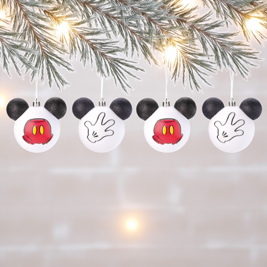 Bolas de Natal inspiradas na roupa clássica do Mickey Disney, ideais para decorar a árvore natalina. Produto licenciado Disney.