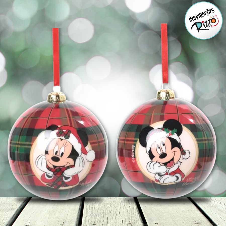Kit composto por 2 bolas de natal, com estampa inspirada no Mickey e Minnie Disney.