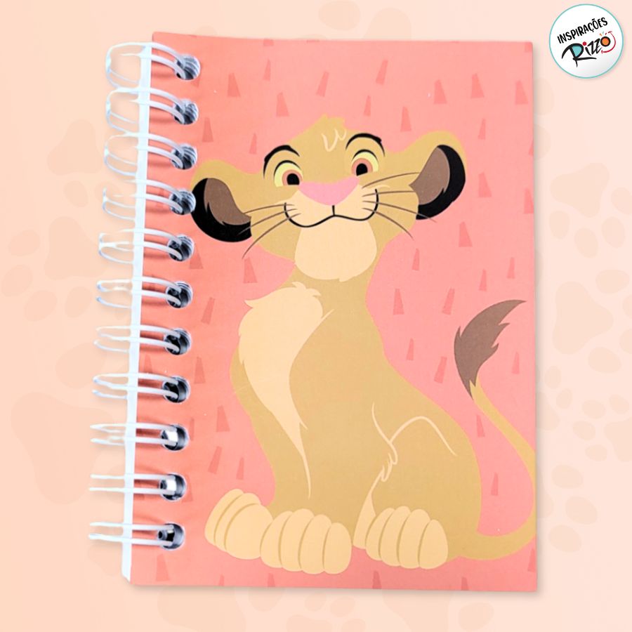 Mini caderno de anotações, folhas brancas pautadas, wire-o em metal, capa tema Simba Rei Leão - Disney