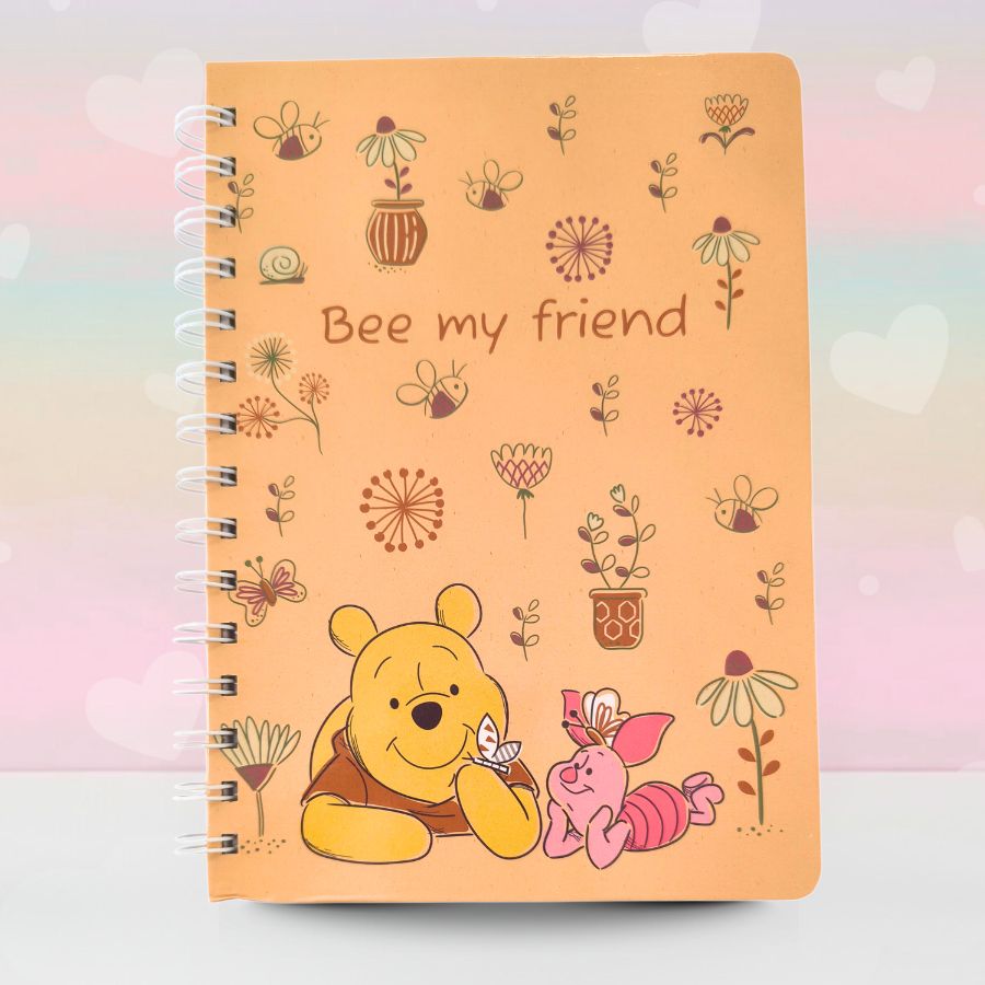 O caderno no tamanho A5 (1/4) conta com encadernação em wire-o, facilitando o manuseio e a abertura total das páginas. Possui 80 folhas internas em papel offset 56g/m², com folhas brancas e pautas pretas, garantindo organização e conforto na escrita. Produto inspirado no Ursinho Pooh Disney, com Estampa Licenciada Disney, ideal para a categoria de papelaria temática com visual delicado e funcional.