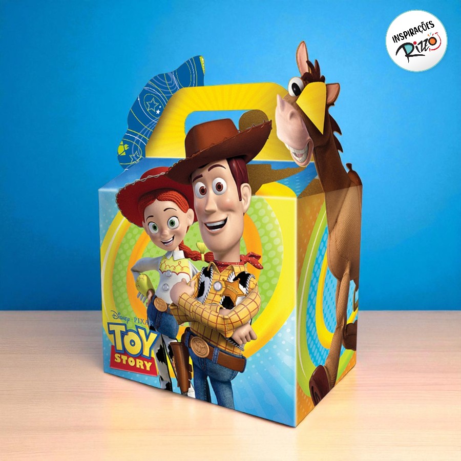 Caixa Surpresa Maleta inspirada em Toy Story Disney, ideal para embalar lembrancinhas de forma divertida e temática. Com formato de maletinha e alça para transporte, apresenta estampa colorida com os personagens Woody Disney, Buzz Lightyear Disney e seus amigos, sendo perfeita para festas infantis com o universo Toy Story.