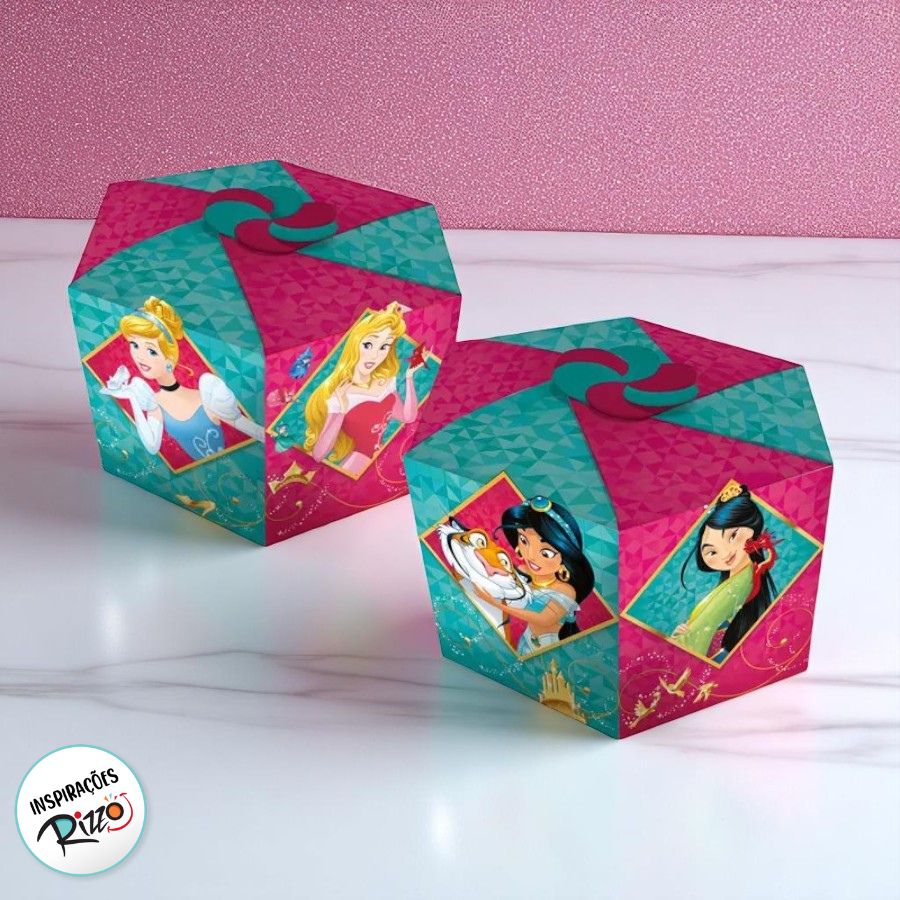 Caixa de papel sextavada, decorada com desenhos inspirado nas Princesas Disney.