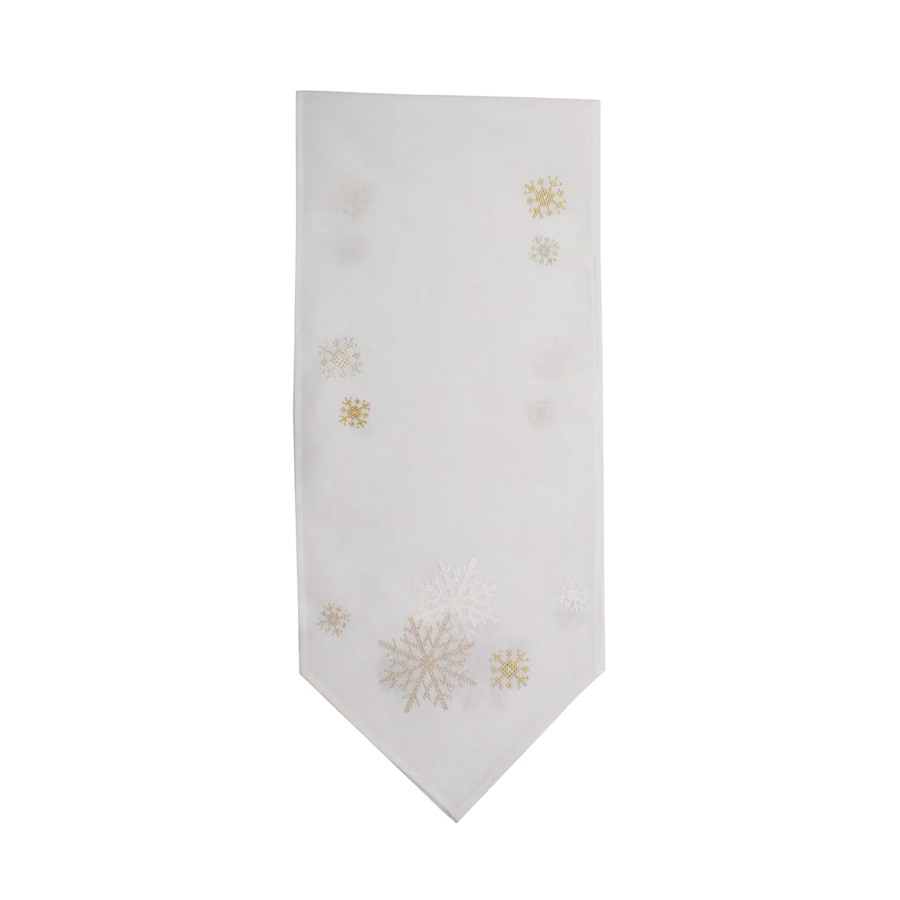 O caminho de mesa adiciona um toque de elegância e estilo à decoração da mesa, criando uma base visualmente atraente para a disposição dos pratos e mobílias. Ele também pode ser combinado com outros elementos decorativos, como arranjos de flores, velas e enfeites temáticos, para criar uma mesa ainda mais atraente e personalizada. Estampa de flocos de neve na cor branco e dourado.