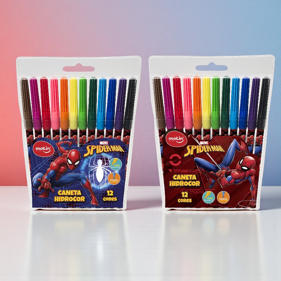 A estampa da embalagem é sortida, sendo enviada 1 unidade contendo 12 cores de caneta hidrocor, conforme disponibilidade de estoque, sem possibilidade de escolha. Ideal para compor material escolar, kits criativos, lembrancinhas e atividades educativas, a Caneta Hidrocor Homem Aranha Disney é perfeita para papelaria menino e papelaria heróis. Combina com lápis de cor, giz de cera, estojos e mochilas do Homem Aranha Disney, tornando cada momento de pintura ainda mais divertido no universo dos heróis Marvel.