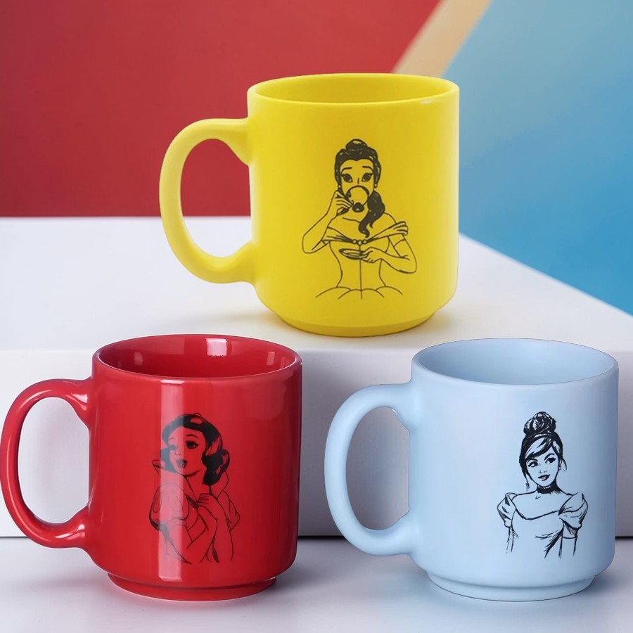 3 canecas com estampas inspiradas em Bela, Cinderela e Branca de Neve Disney