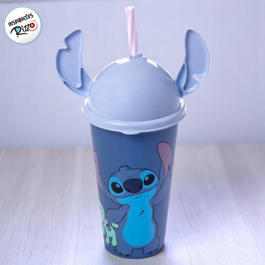 Copo com tampa e canudo, tema Stitch. Licenciado Disney