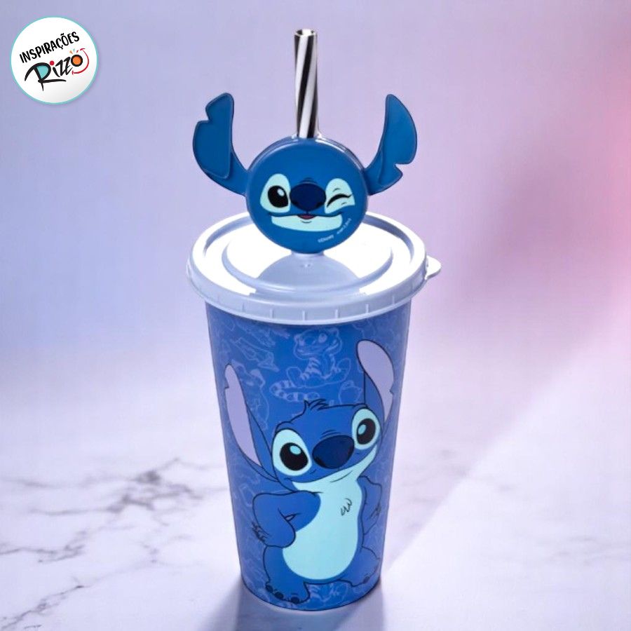Copo com tampa e canudo, tema Stitch. Licenciado Disney