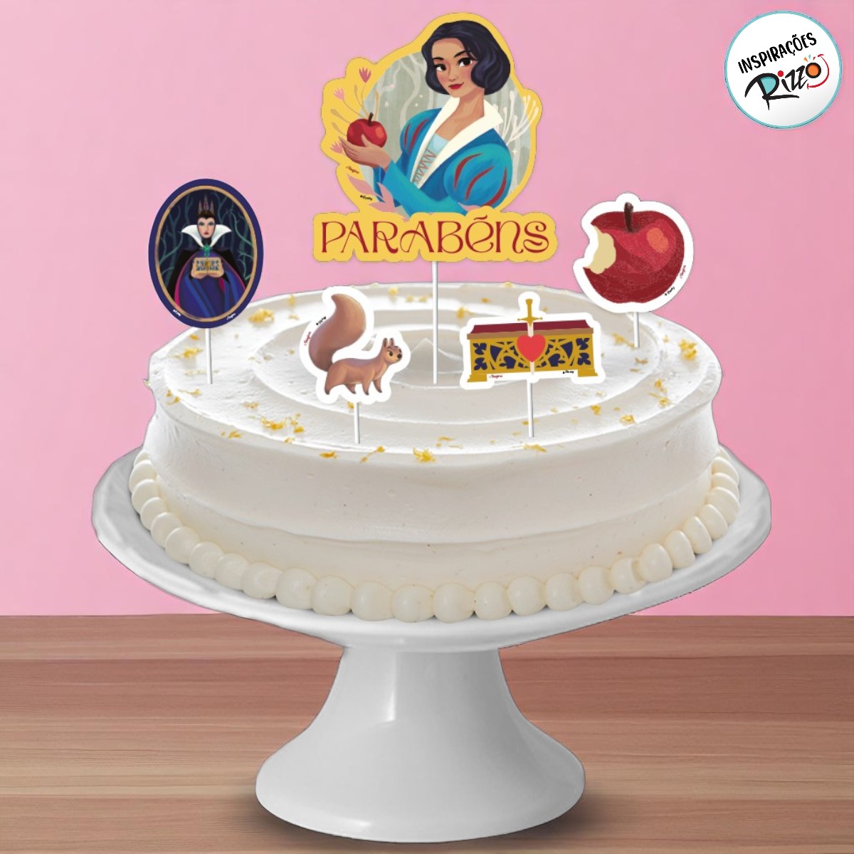 Decoração de Bolo inspirada na Princesa Disney Branca de Neve, ideal para dar um toque encantador ao topo do bolo em festas infantis temáticas. O conjunto é composto por uma peça principal com a personagem e mais quatro elementos complementares, todos com palito para fácil fixação.