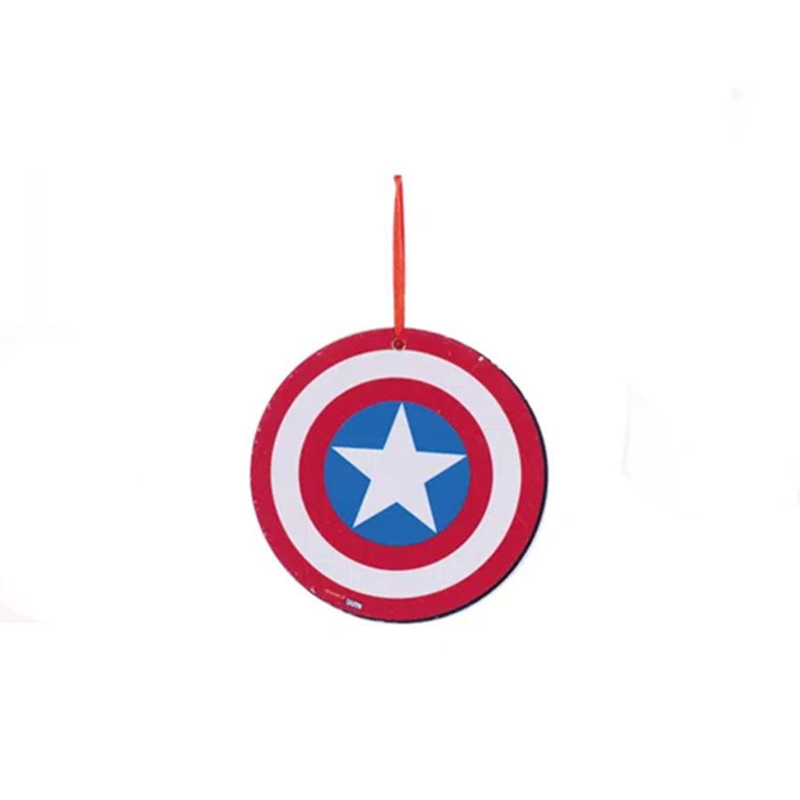 Enfeite para pendurar com o escudo do Capitão América. Produto licenciado Disney, ideal para festas e decorações temáticas. Estampa licenciada Marvel.
