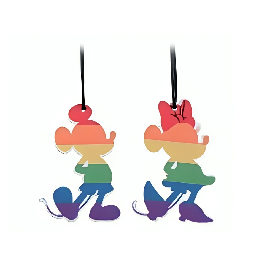 Enfeite de pendurar com a silhueta dos personagens Turma do Mickey, nas cores do arco-íris.
