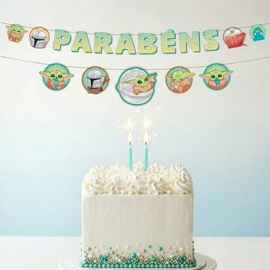 Na ambientação, a Faixa Parabéns - Grogu Disney - Star Wars - Disney Original pode ser utilizada acima da mesa principal, em painéis, paredes ou espaços de fotos, criando um ponto de destaque que reforça o tema da festa. Combina perfeitamente com balões em tons pastéis, toppers, picks para doces, tubetes personalizados, cachepots e outros itens decorativos do tema Baby Yoda Disney. Também pode ser integrada a composições com verde suave, azul claro, bege e branco, mantendo a proposta leve e harmoniosa da decoração. A versatilidade das duas faixas permite distribuir os elementos de forma criativa, contribuindo para um ambiente organizado, temático e visualmente encantador em festas infantis.