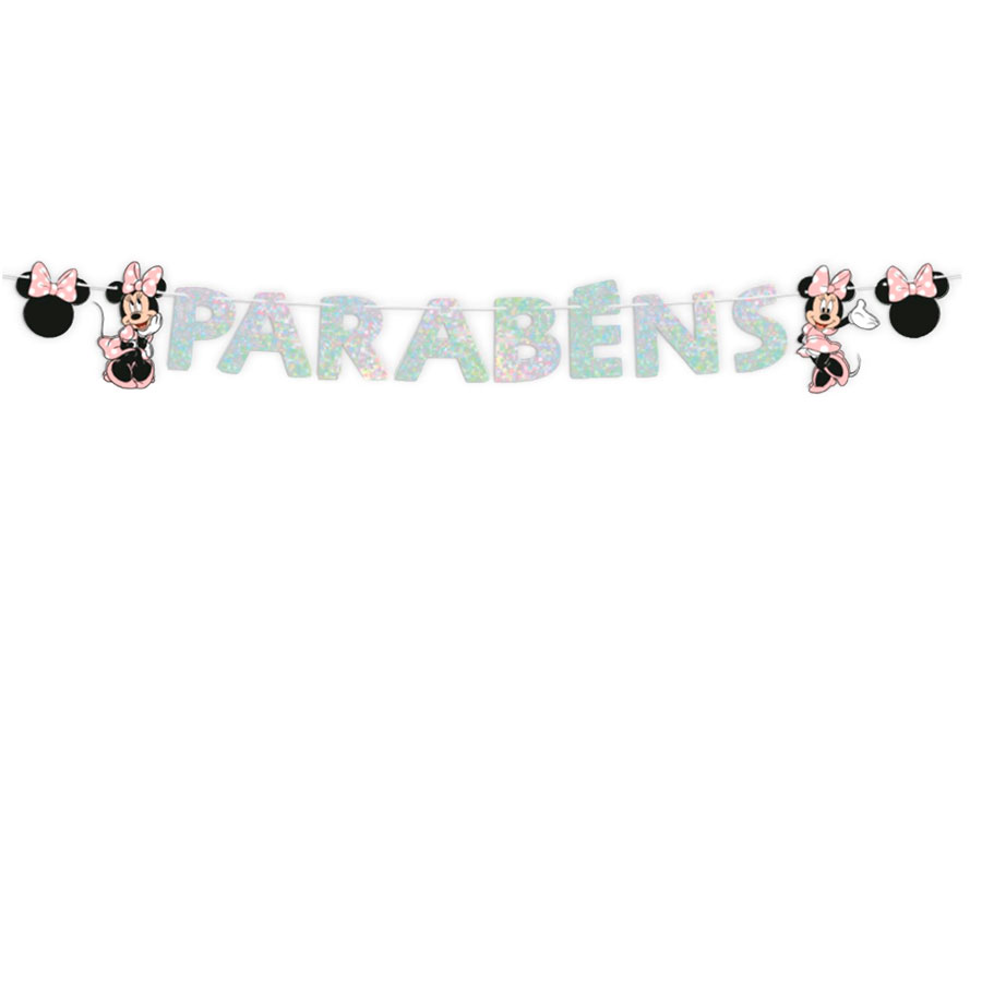 Um pacote contendo uma faixa de aninversario da personagem Minnie Mouse escrito "parabéns"