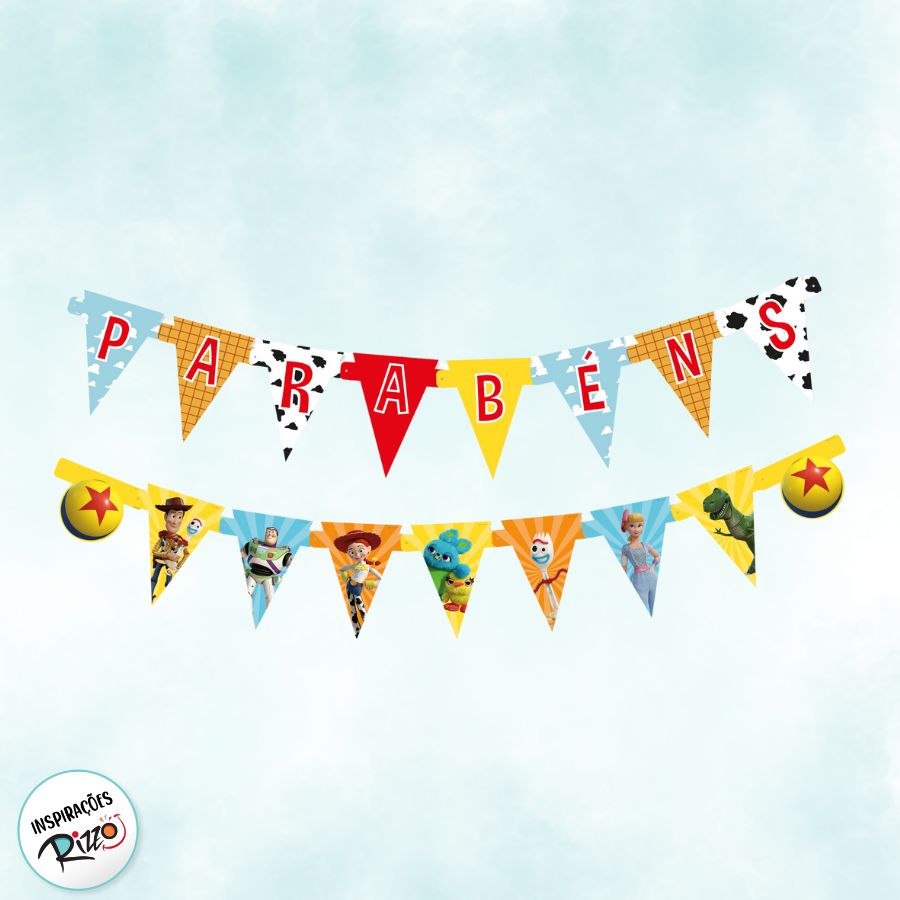 Faixa Parabéns inspirada no universo de Toy Story 4 Disney, perfeita para destacar a decoração da festa com os personagens mais queridos do mundo dos brinquedos. Em formato de flâmulas com a frase "Parabéns" e ilustrações coloridas, o kit é composto por duas faixas: uma medindo 1,3m x 17cm e outra com 80cm x 15,5cm.
