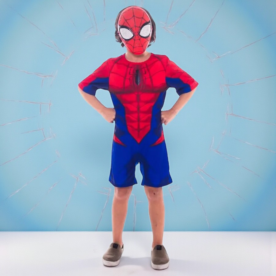 Fantasia infantil inspirada em Homem Aranha Marvel, Composta por uma máscara e um macacão modelo curto.