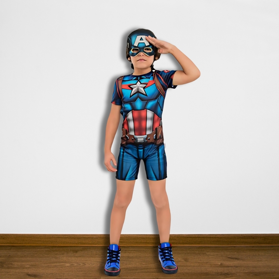 Fantasia do Capitão América com macacão curto e máscara, para crianças de 10 a 12 anos, perfeita para eventos e brincadeiras com tema de heróis.