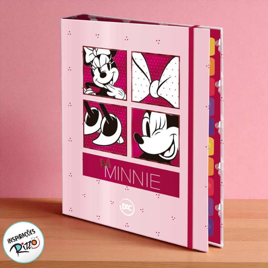 Mini Fichário 4 furos com estampa licenciada inspirada Minnie Mouse Disney, acompanha 48 folhas pautadas e decoradas e 10 divisorias coloridas lisas.