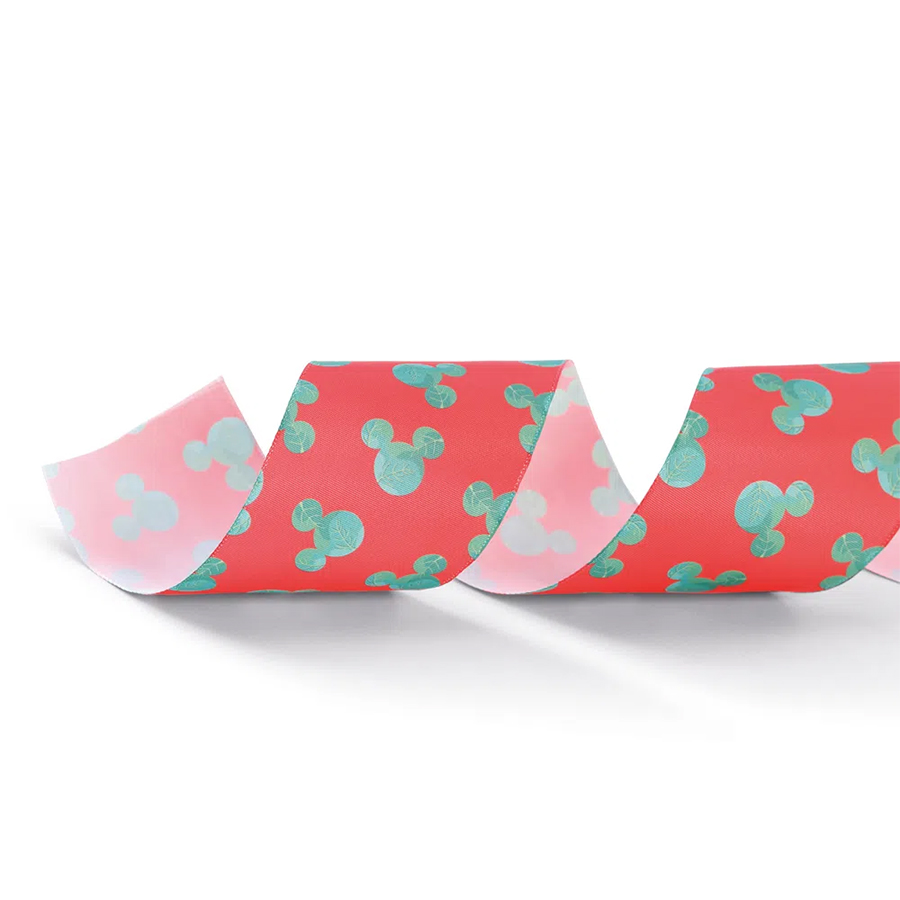 A fita de cetim tem o fundo da cor vermelha, e possuí a silhueta do rostinho do Mickey na cor verde.