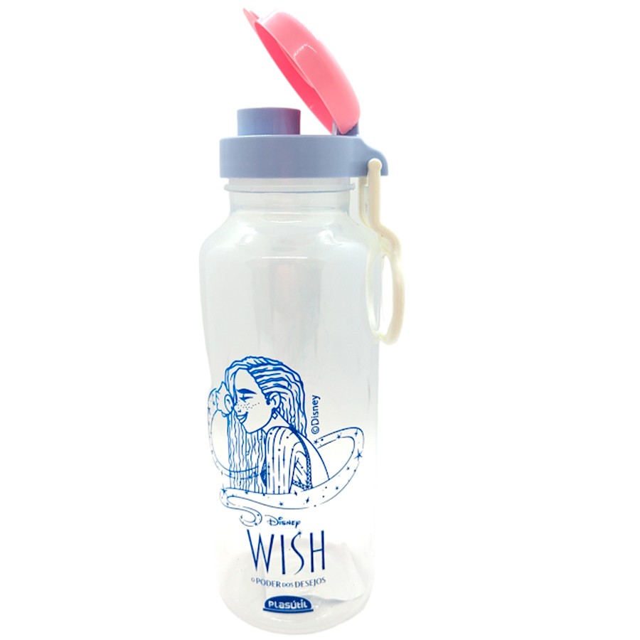Garrafa com tampa abre facil, alça e cartela de adesivos, no tema do filme Wish