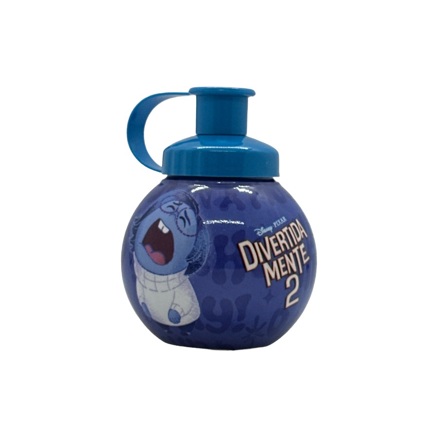 Garrafa Squeeze Divertidamente, com formato bolinha, decorada com desenhos da Tristeza e da Vergonha e bico na cor azul.