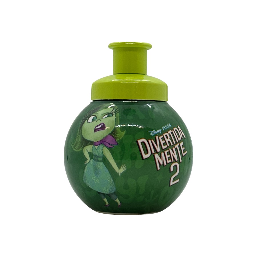 Garrafa Squeeze Divertidamente, com formato bolinha, decorada com desenhos da Nojinho e da Inveja e bico na cor verde.