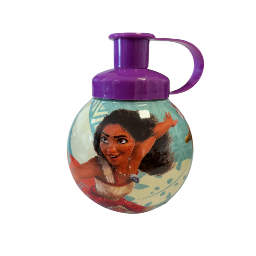 Garrafa Squeeze em formato Bolinha com estampa da Princesa Moana, com fundo azul e tampa Roxa