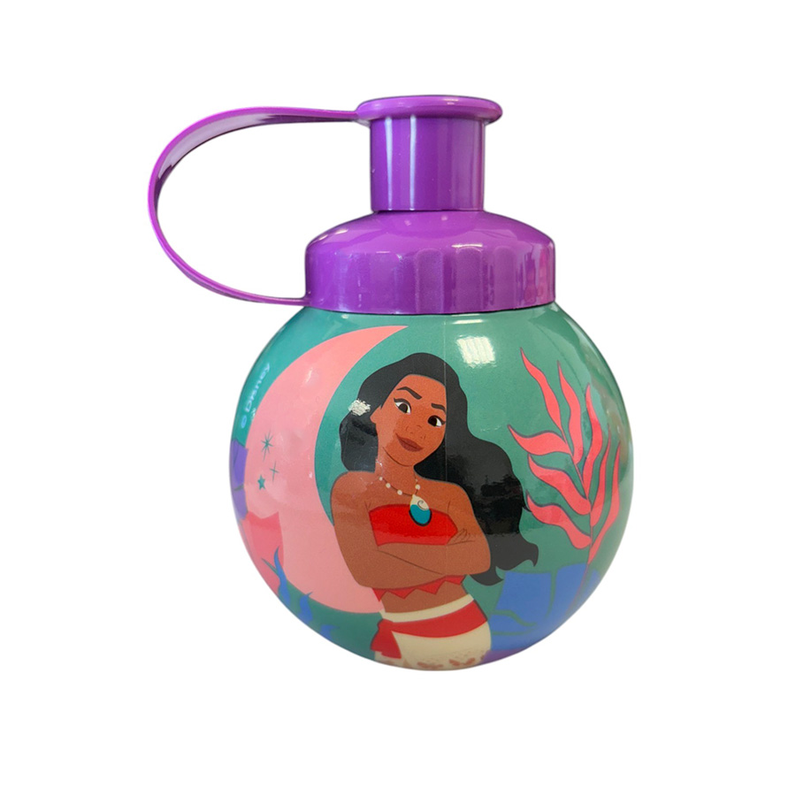 Garrafa Squeeze em formato Bolinha, com tema Princesa Moana, com fundo verde e tampa Roxa