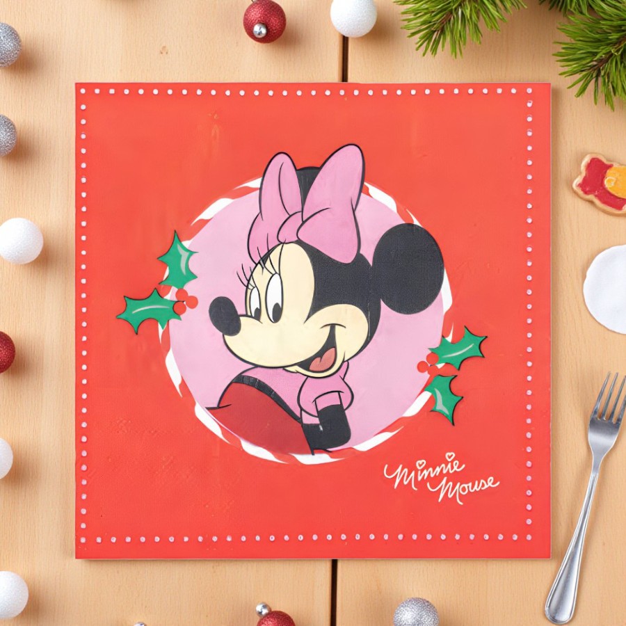 Guardanapo de papel vermelho com temática da personagem Minnie, destacando-a no centro do guardanapo, com seu grande laço e fundo rosa, com moldura circular branco e vermelho de bengala doce, com azevinhos na moldura, e sua assinatura "Minnie Mouse" em letra de mão branca no lado inferior direito da moldura, no papel vermelho