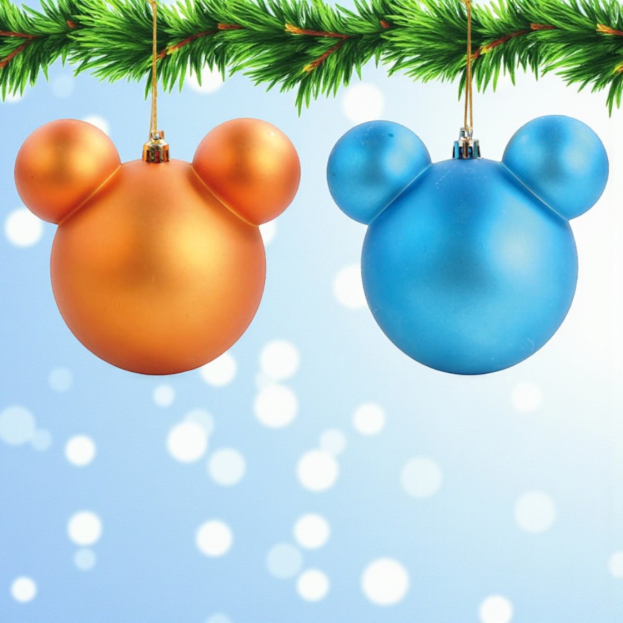 Kit de bolas de Natal nas cores azul e laranja, com design inspirado no Mickey, perfeito para quem busca uma Decoração Natalina moderna e colorida. Um toque especial para sua árvore, com a autenticidade dos produtos Disney.
