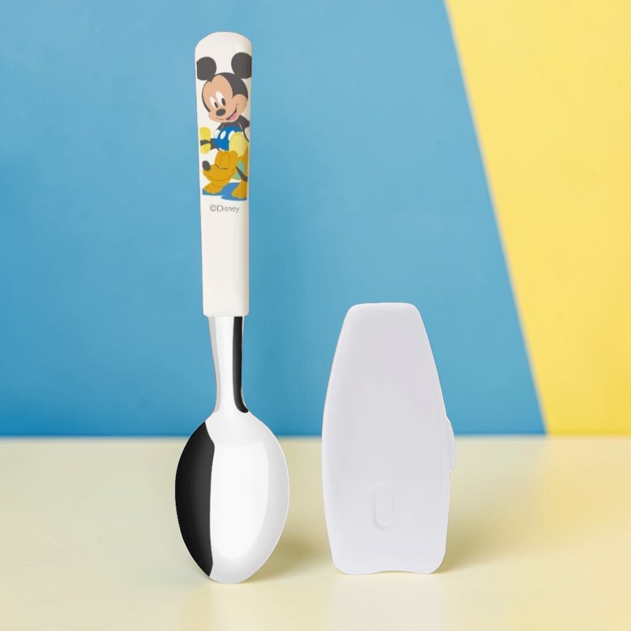 A colher é produzida em aço inoxidável com cabo em polipropileno livre de BPA e acompanha protetor higiênico, permitindo transportar com mais organização para passeios e saídas. Indicado para maiores de 4 meses, o kit pode ir à lava-louças, trazendo praticidade para a rotina diária. Pode ser combinado com copos, potes e demais acessórios do Mickey Mouse Disney já trabalhados no portfólio, criando uma composição coordenada para a fase inicial da alimentação.