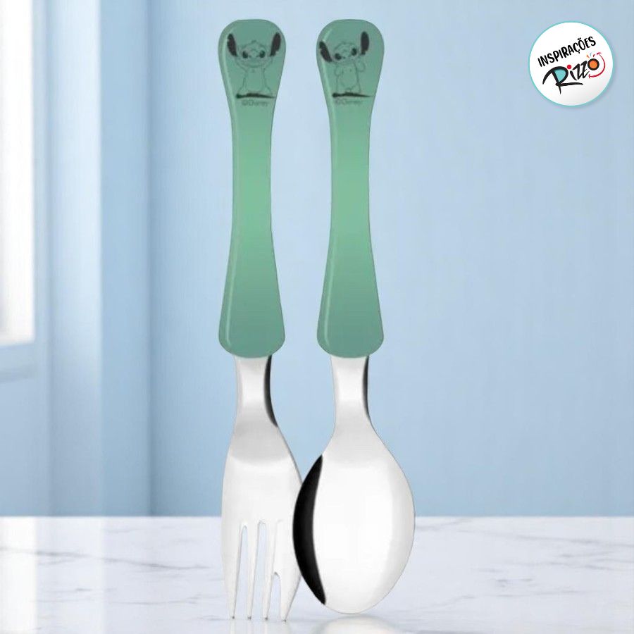 Kit composto por uma colher e um garfo infantil, tema Stitch. Licenciado Disney