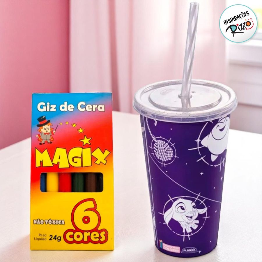 Acompanha um giz de cera com 6 cores - 24g, com selo de qualidade do INMETRO, ideal para colorir diretamente no copo. Este produto é indicado para crianças maiores de 3 anos e é uma ótima sugestão de lembrancinha criativa para festas temáticas, eventos escolares ou atividades em casa. Estimula a imaginação e desenvolve a coordenação motora, enquanto diverte e decora o dia a dia dos pequenos.