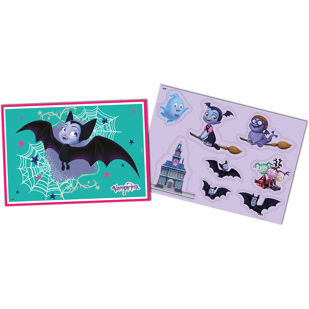 Kit composto por 1 painel e 8 figuras destacáveis, perfeitos para decorar sua festa Vampirina de maneira encantadora.