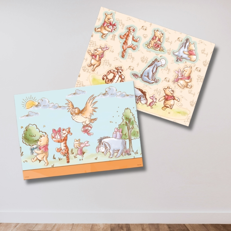 O Kit Decorativo Ursinho Pooh contém peças impressas em cores vivas e de alta qualidade, com dimensões de 64x40cm. Ideal para festas temáticas e decorações infantis, ele proporciona praticidade na montagem e excelente acabamento visual.
