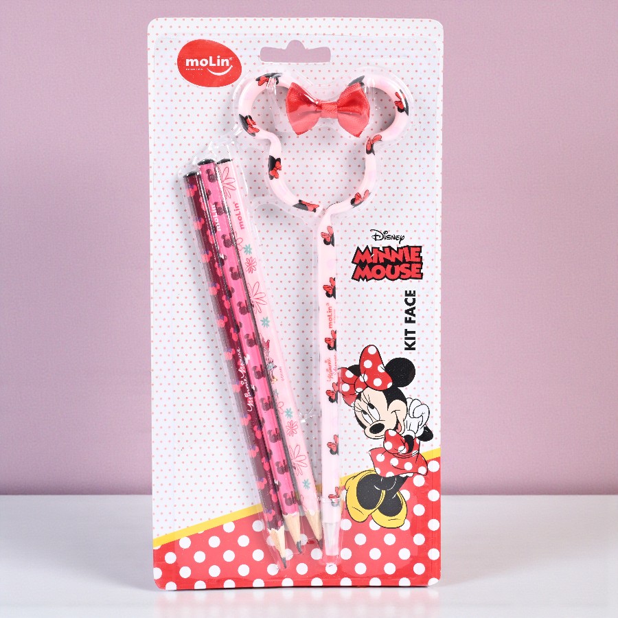 Kit Escolar - Minnie Mouse Rosa - 4 Itens Minnie Mouse Disney reúne praticidade e visual encantador para a rotina escolar e criativa. O conjunto com três lápis de escrever HB preto e uma caneta esferográfica em formato da cabeça da personagem, com decoração temática e lacinho vermelho, facilita anotações, atividades em classe e tarefas em casa, ao mesmo tempo em que valoriza o design delicado. A proposta visual combina com disney festas, sendo ideal para montar kits presenteáveis, lembrancinhas e composições temáticas. Harmoniza facilmente com Adesivo Redondo - Minnie Mouse Rosa, cadernos do mesmo tema e estojos coordenados, criando um conjunto alegre e organizado para o dia a dia.