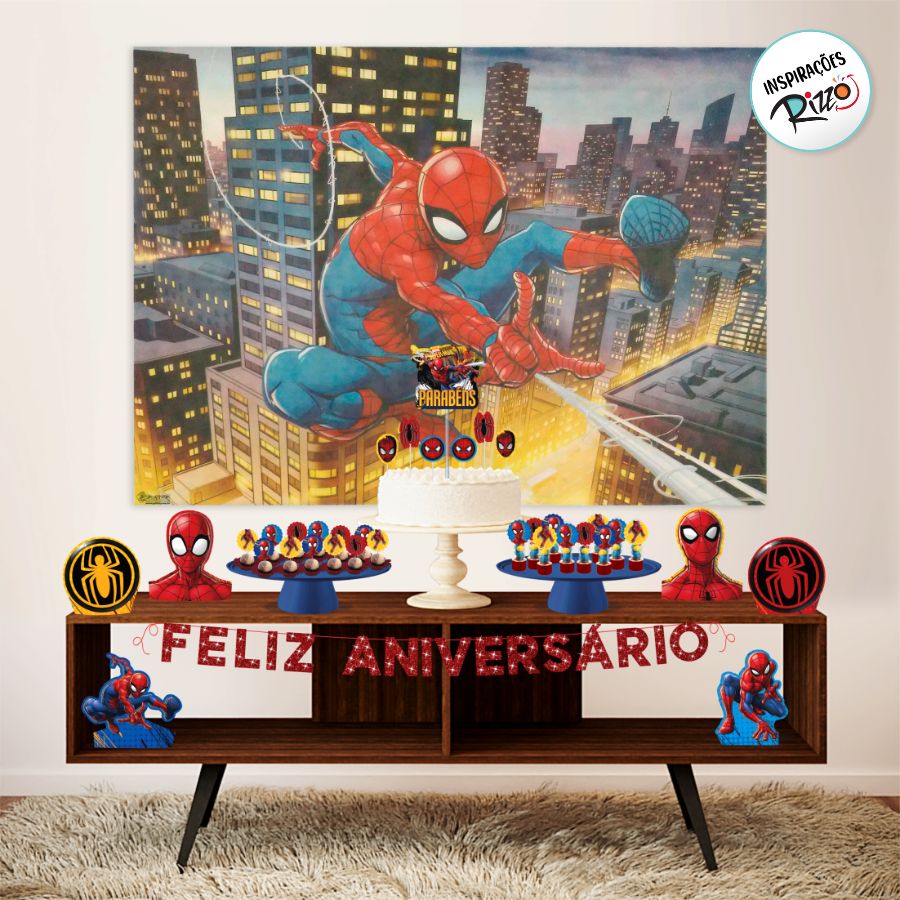 Kit festa, tema Homem Aranha, composto por: 1 painel tnt sublimado + 7 toppers para bolo + 24 palitos decorativos para docinhos + 6 decorações de mesa + 1 faixa. Produto Licenciado Disney
