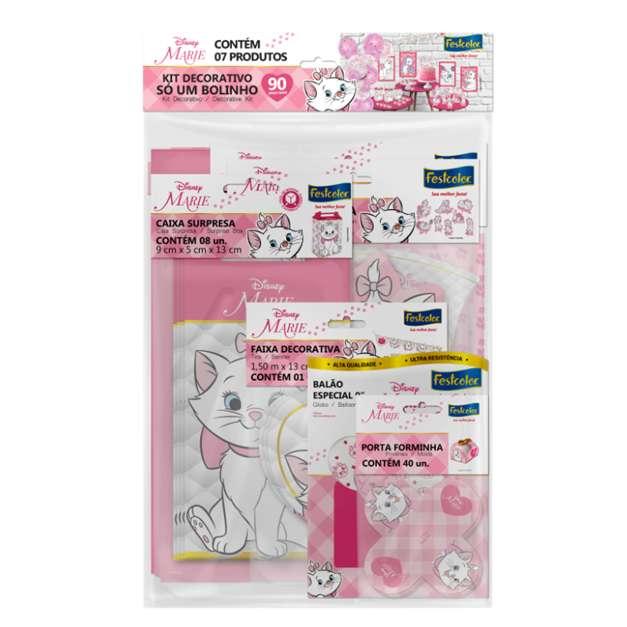 Este kit é a solução completa para quem busca uma decoração temática da Marie, proporcionando praticidade e beleza para sua festa. Todos os itens são fabricados em papel cartão, oferecendo uma decoração elegante e de fácil aplicação.