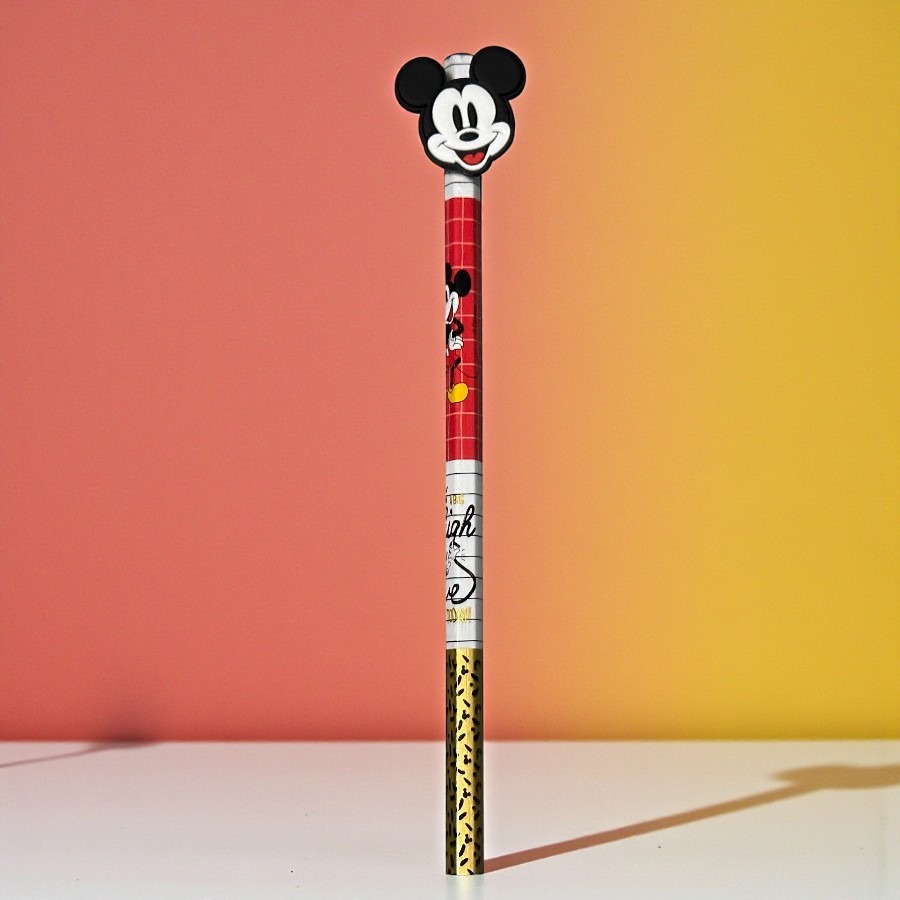 O aplique removível torna o lápis versátil e colecionável, permitindo combinações com outros itens do Mickey Mouse, como canetas esferográficas, lapiseiras e estojos temáticos. Vendido de forma individual, é perfeito para montar kits escolares personalizados, brindes e lembrancinhas. A proposta interativa valoriza a experiência de uso no dia a dia, destacando o personagem em diferentes momentos de estudo e organização.
