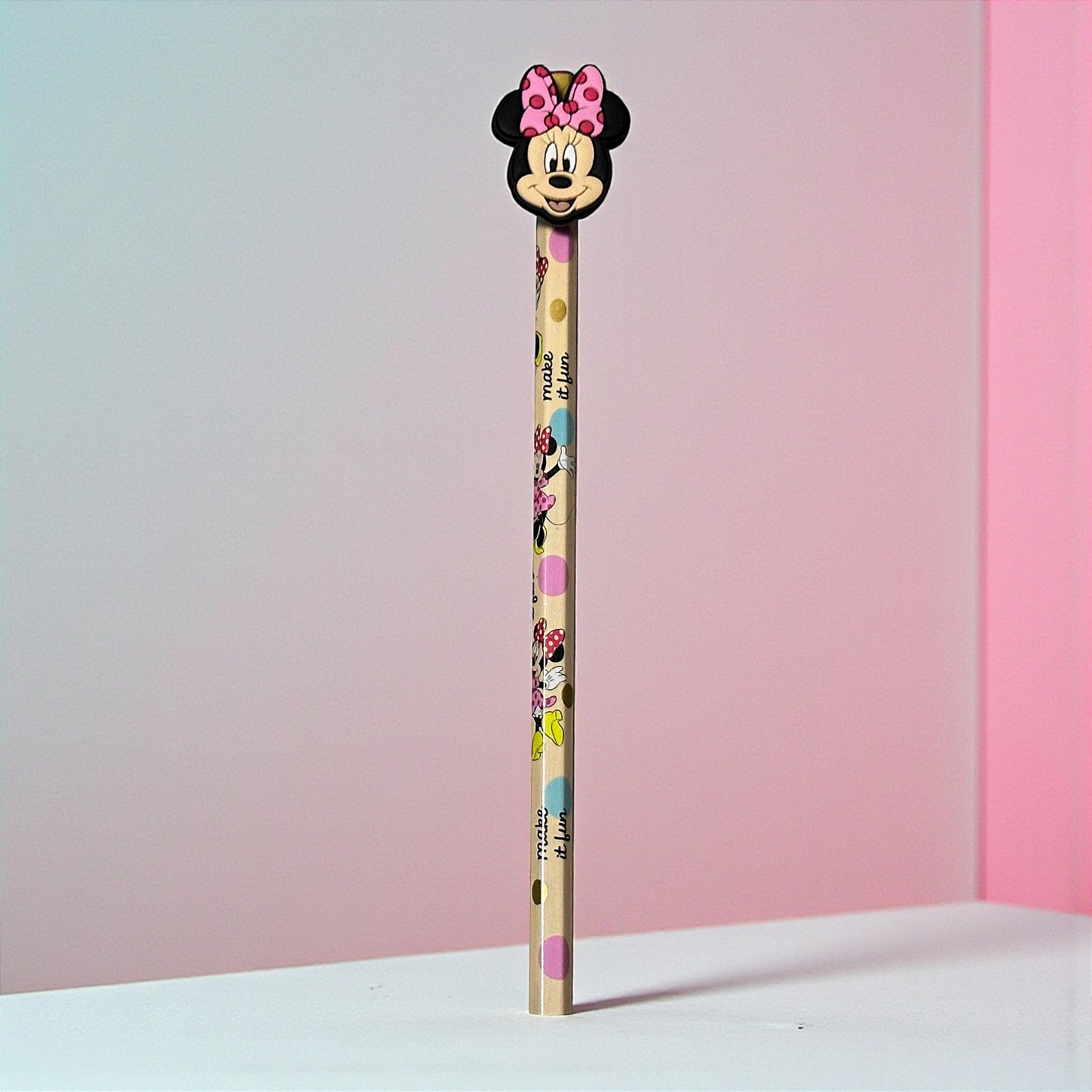 O aplique removível possibilita reaproveitamento, já que pode ser aplicado em outro lápis ou acessório quando este acabar, tornando o item versátil e colecionável. O visual temático transforma o lápis em um destaque no estojo e combina facilmente com canetas Minnie, lapiseiras, estojos decorados e outros itens do mesmo personagem. Ideal para uso diário, coleção, montagem de kits escolares, brindes e lembrancinhas, unindo utilidade e beleza em um único produto.