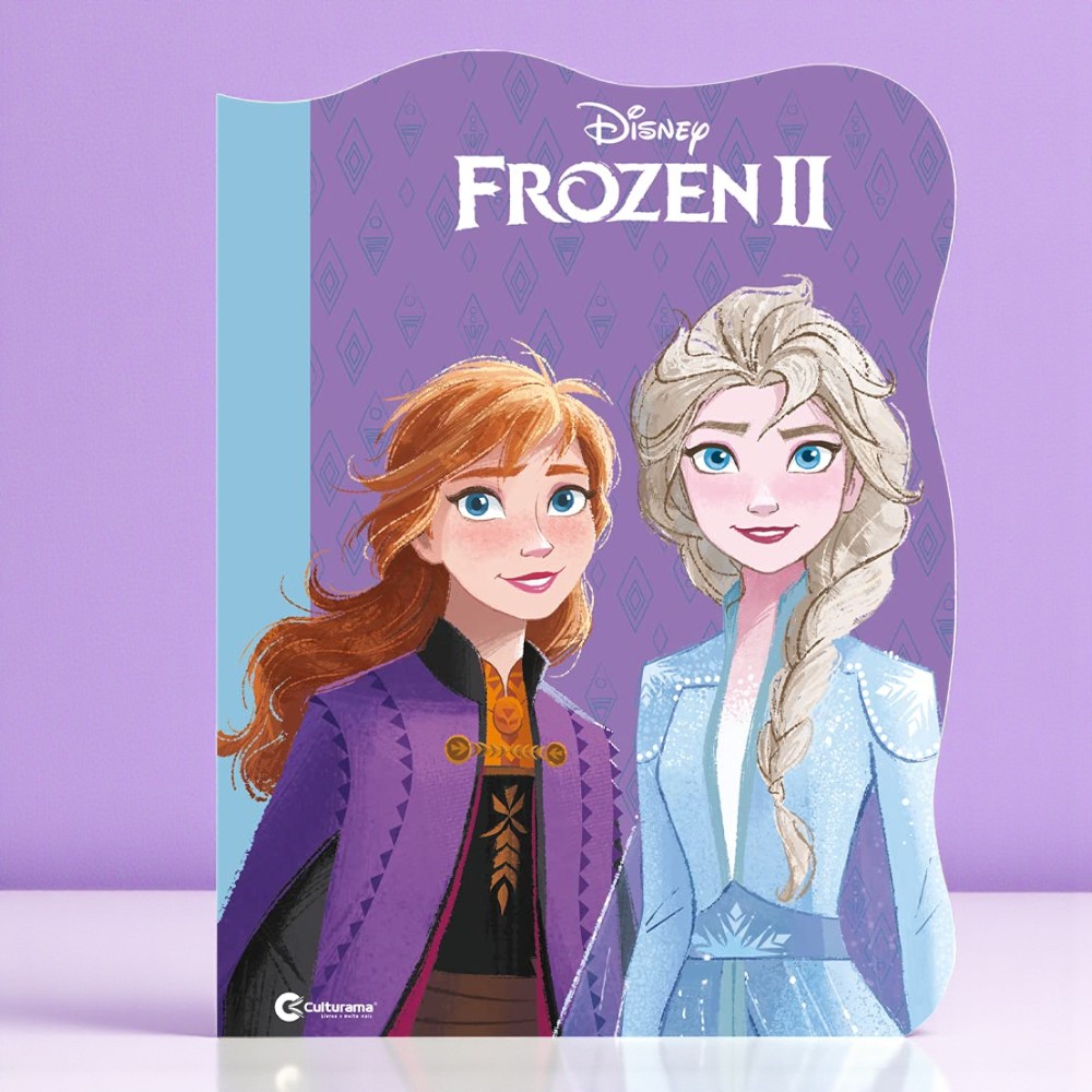 Livro ilustrado inspirado em Frozen II Disney, com capa fosca e verniz localizado. Formato recortado divertido, ideal para presentear e usar como lembrancinha de festa.