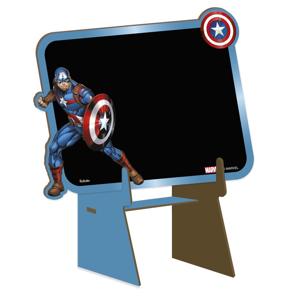 Lousa decorada com design do Capitão América. Ideal para decoração de festas temáticas ou ambientes de fãs da Marvel.